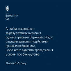 Довідка містить правові висновки Верховного Суду, які сприятимуть забезпеченню сталості та єдності судової практики стосовно визнання недійсними правочинів боржника, щодо якого відкрито провадження у справі про банкрутство.