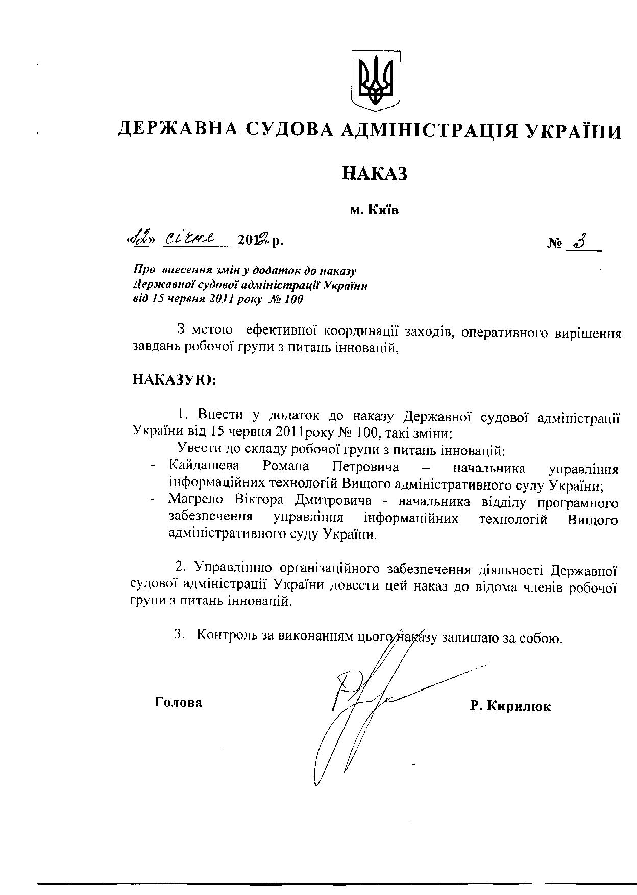 Наказ Державної судової адміністрації України від 12 січня 2012 року № 3 "Про внесення змін у додатку до наказу Державної судової адміністрації України від 15 червня 2011 року № 100 "