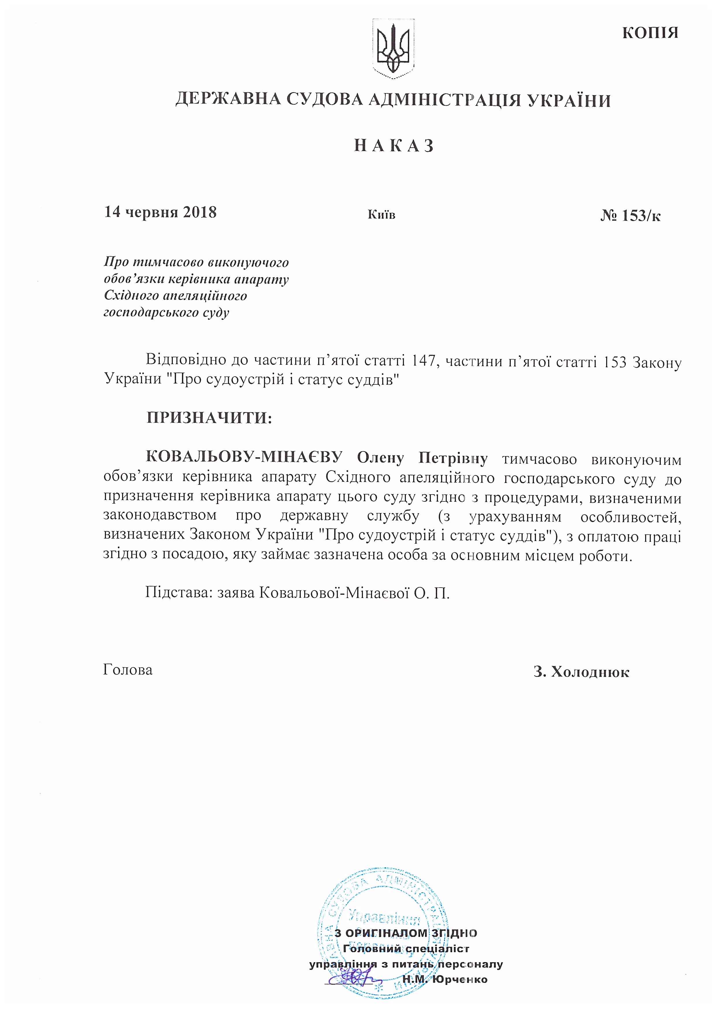 Наказ Державної судової адміністрації України від 14 червня 2018 року №153/к Про тимчасово виконуючого обов'язки керівника апарату Східного апеляційного господарського суду