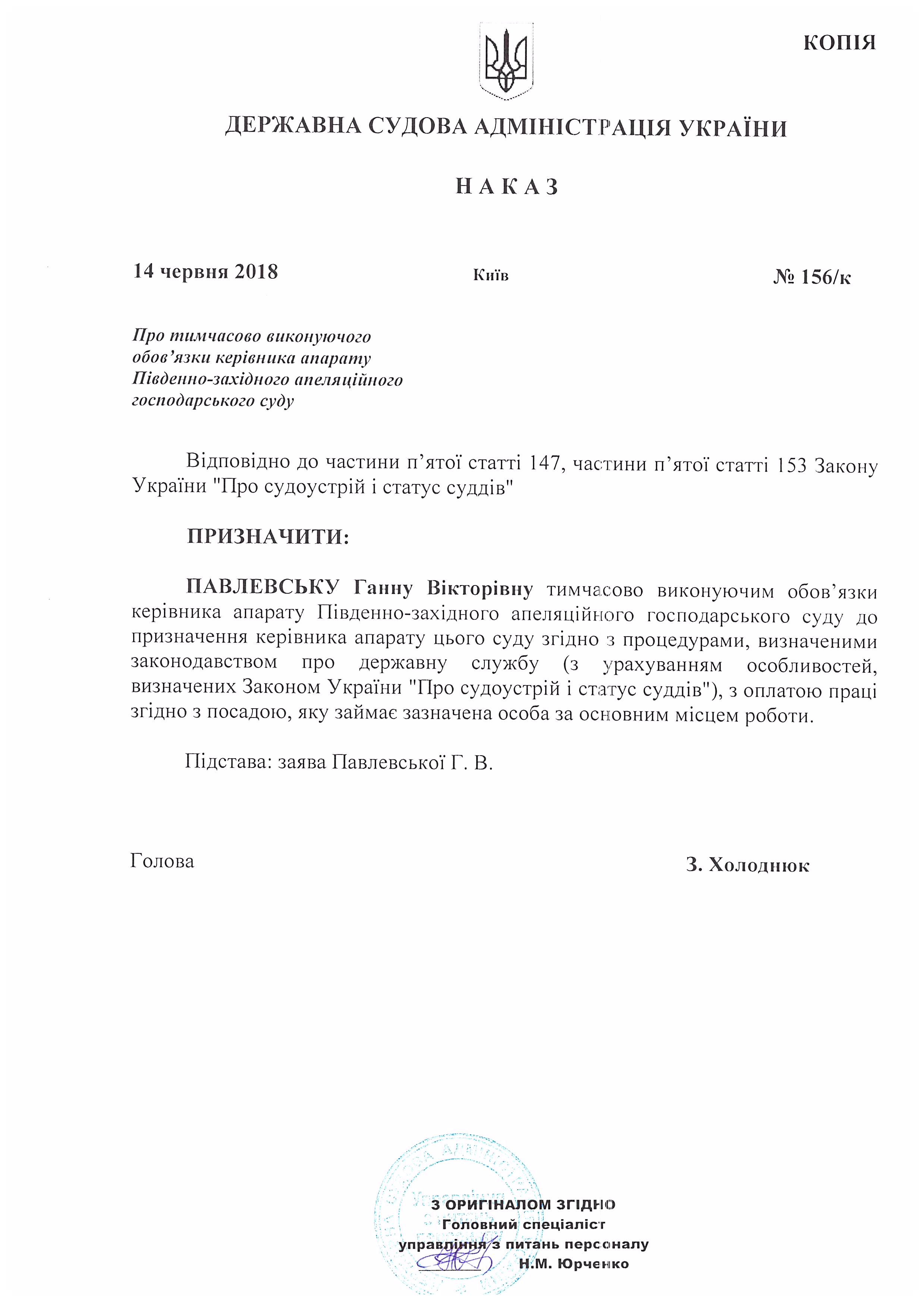 Наказ Державної судової адміністрації України від 14 червня 2018 року №156/к Про тимчасово виконуючого обов'язки керівника апарату Південно-західного апеляційного господарського суду