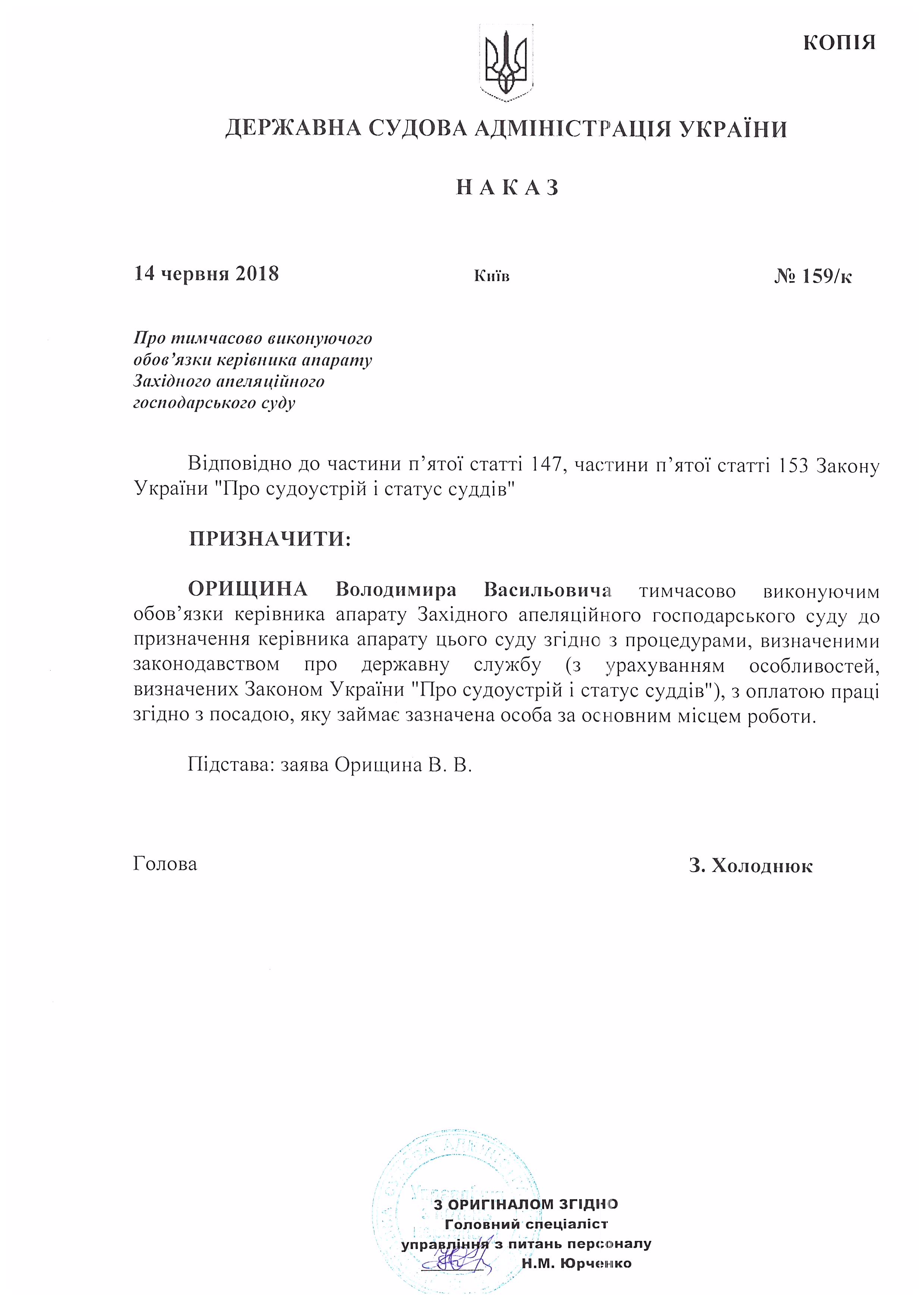 Наказ Державної судової адміністрації України від 14 червня 2018 року №159/к Про тимчасово виконуючого обов'язки керівника апарату Західного апеляційного господарського суду