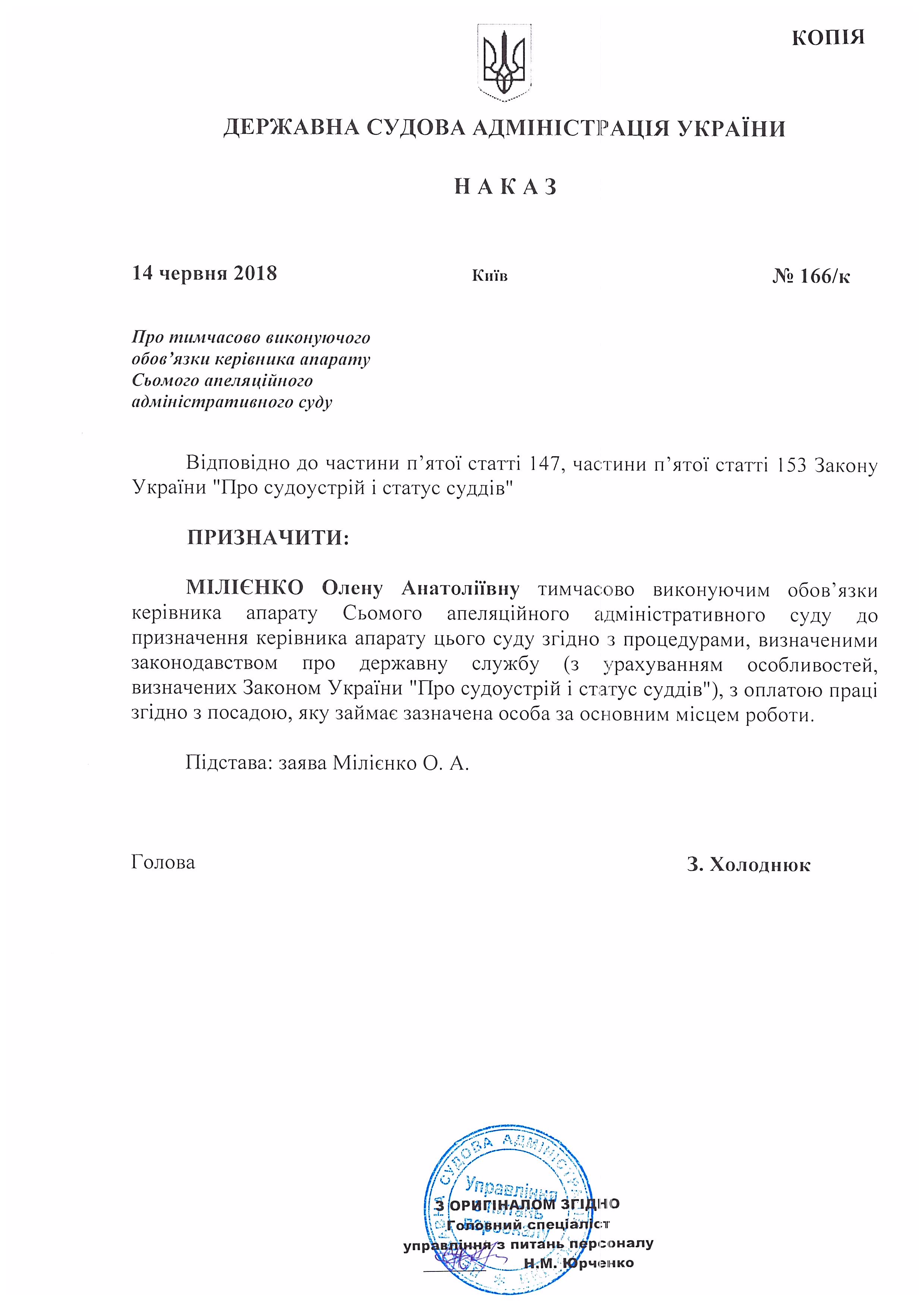 Наказ Державної судової адміністрації України від 14 червня 2018 року №166/к Про тимчасово виконуючого обов'язки керівника апарату Сьомого апеляційного адміністративного суду