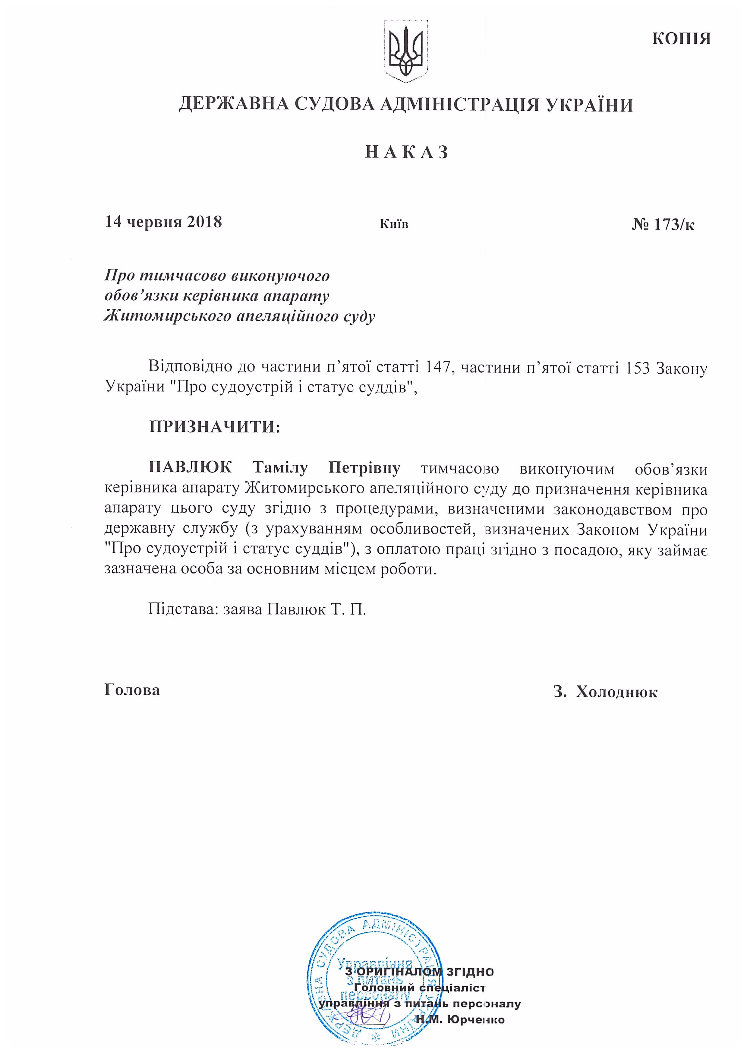 Наказ Державної судової адміністрації України від 14 червня 2018 року №173/к Про тимчасово виконуючого обов'язки керівника апарату Житомирського апеляційного суду