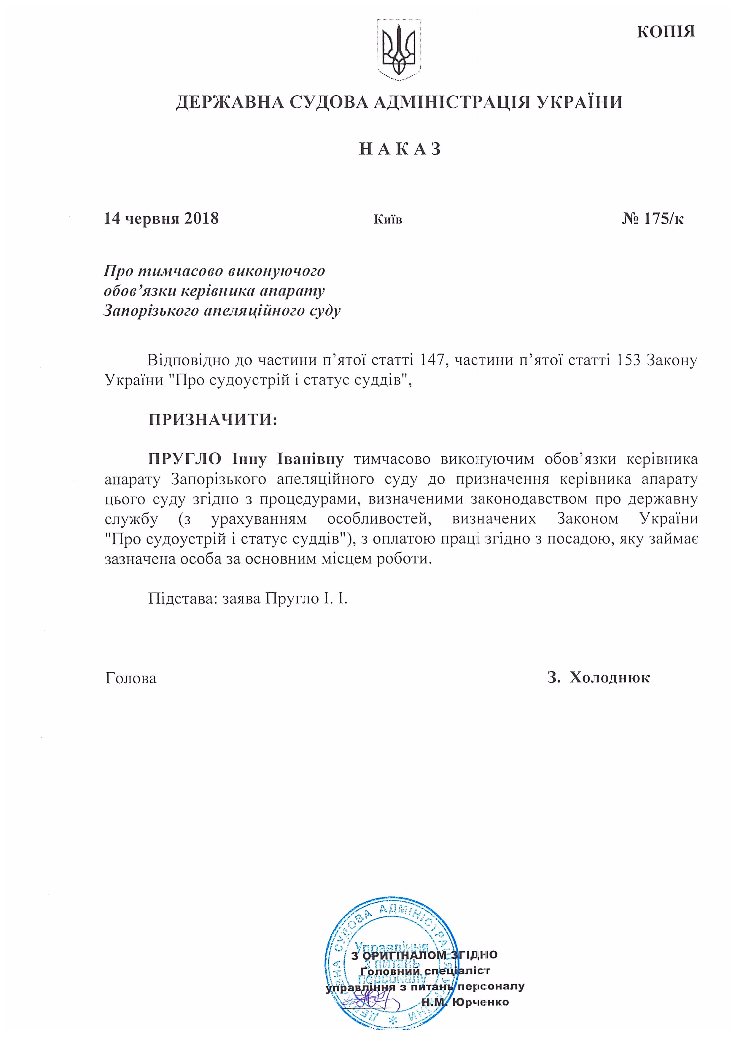 Наказ Державної судової адміністрації України від 14 червня 2018 року №175/к Про тимчасово виконуючого обов'язки керівника апарату Запорізького апеляційного суду