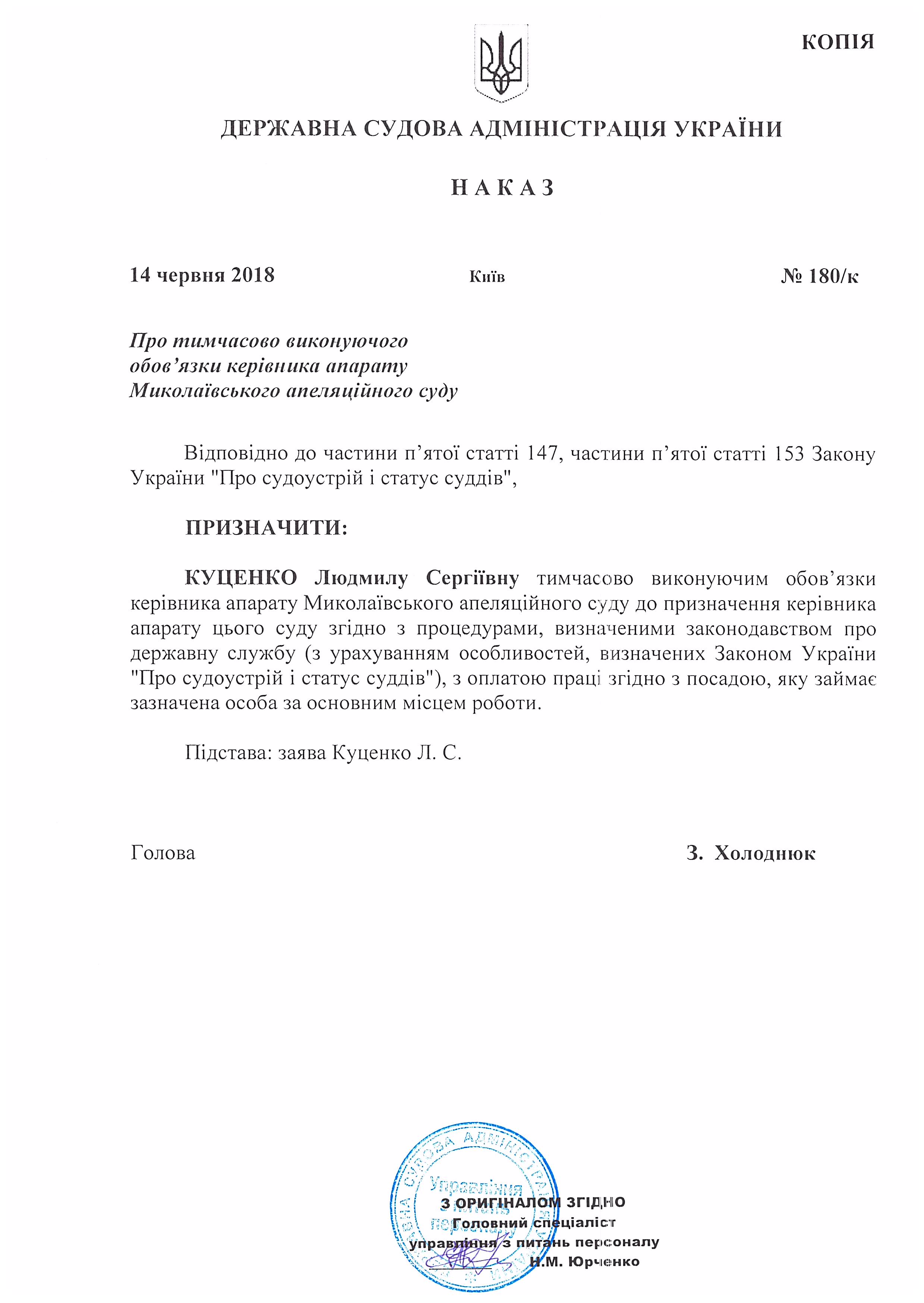 Наказ Державної судової адміністрації України від 14 червня 2018 року №180/к Про тимчасово виконуючого обов'язки керівника апарату Миколаївського апеляційного суду