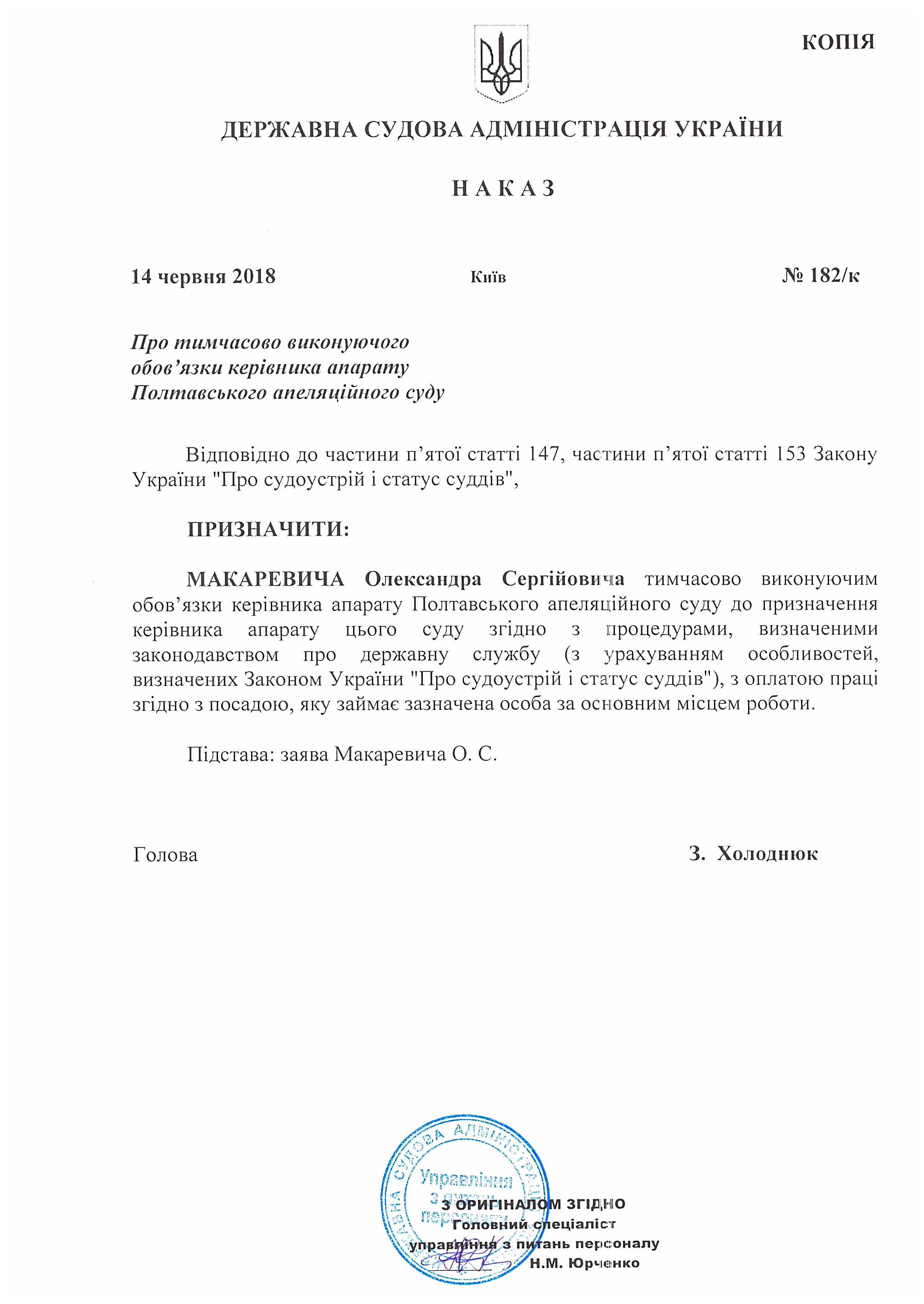 Наказ Державної судової адміністрації України від 14 червня 2018 року №182/к Про тимчасово виконуючого обов'язки керівника апарату Полтавського апеляційного суду
