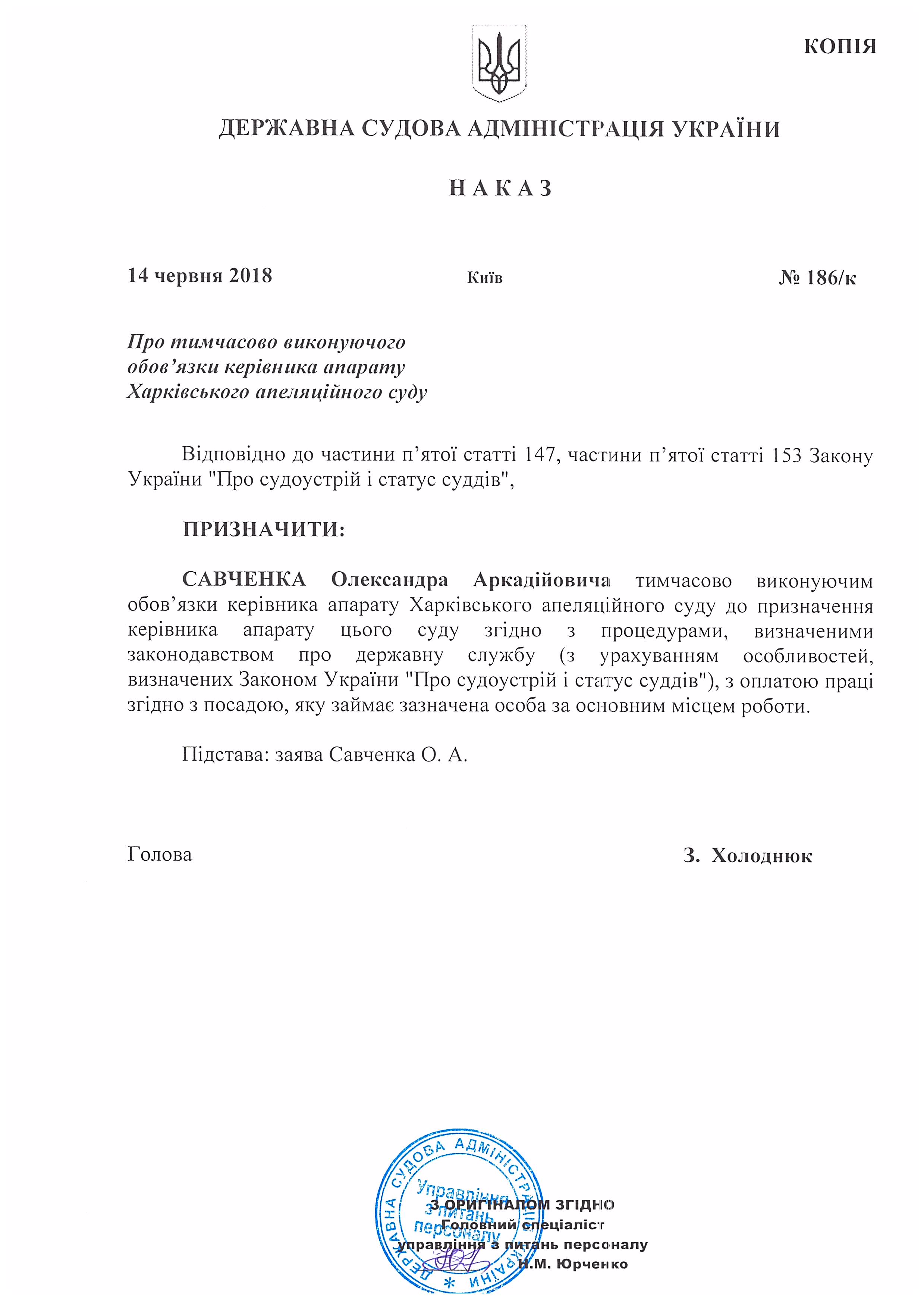 Наказ Державної судової адміністрації України від 14 червня 2018 року №186/к Про тимчасово виконуючого обов'язки керівника апарату Харківського апеляційного суду