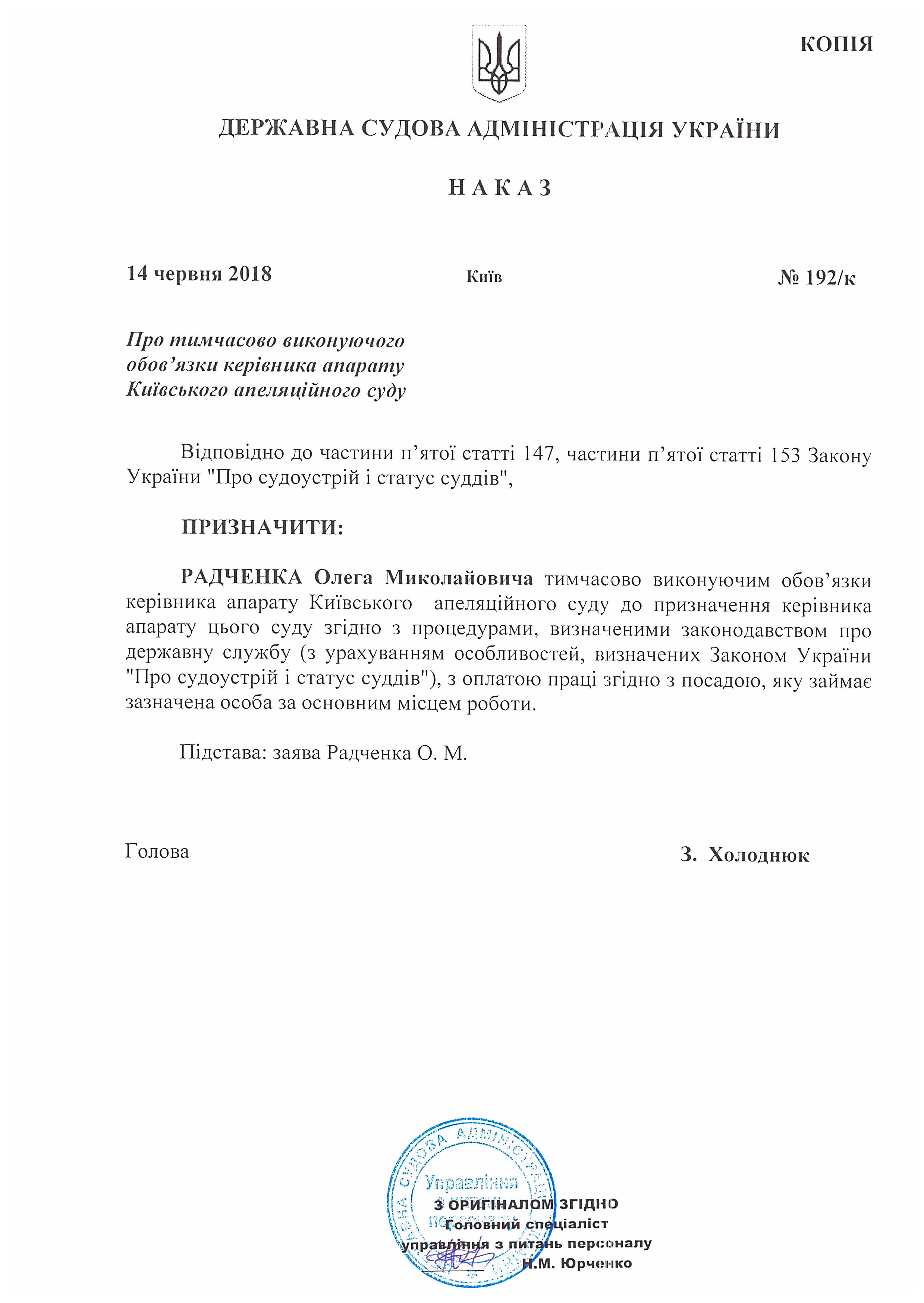 Наказ Державної судової адміністрації України від 14 червня 2018 року №192/к Про тимчасово виконуючого обов'язки керівника апарату Київського апеляційного суду
