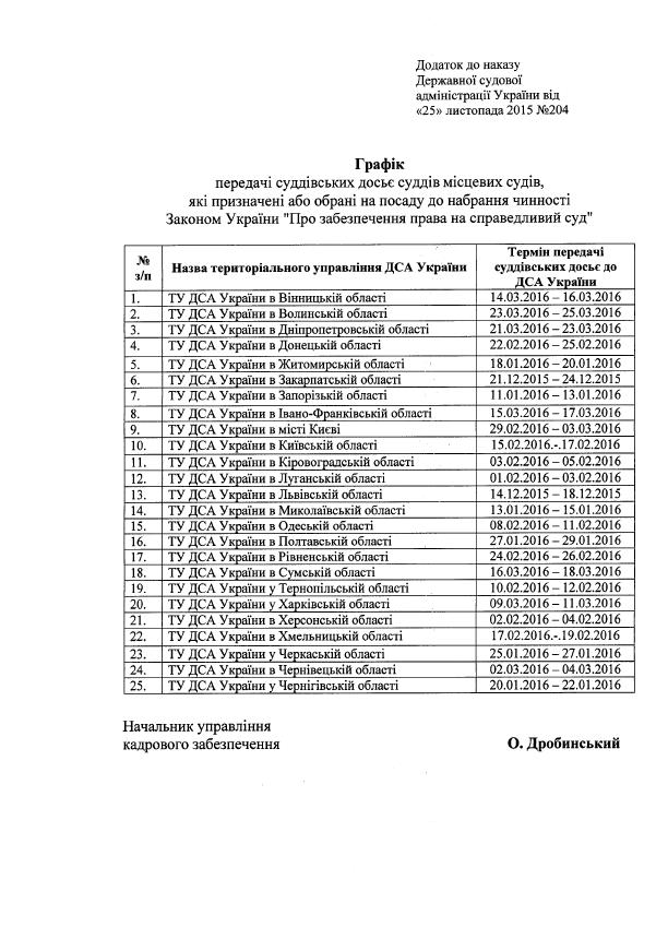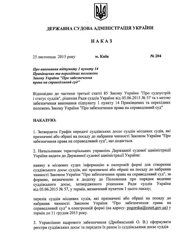 Наказ від 25 листопада 2015 року №204 “Про виконання підпункту 1 пункту 14 Прикінцевих та перехідних положень Закону України "Про забезпечення права на справедливий суд”