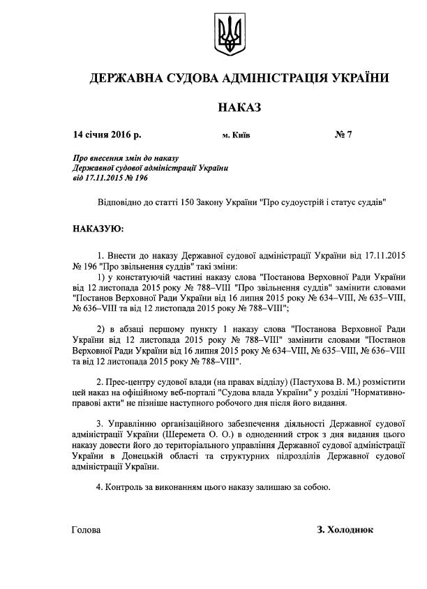 Наказ від 14 січня 2016 року №7 “Про внесення змін до наказу Державної судової Адміністрації України від 17.11.2015 №196”