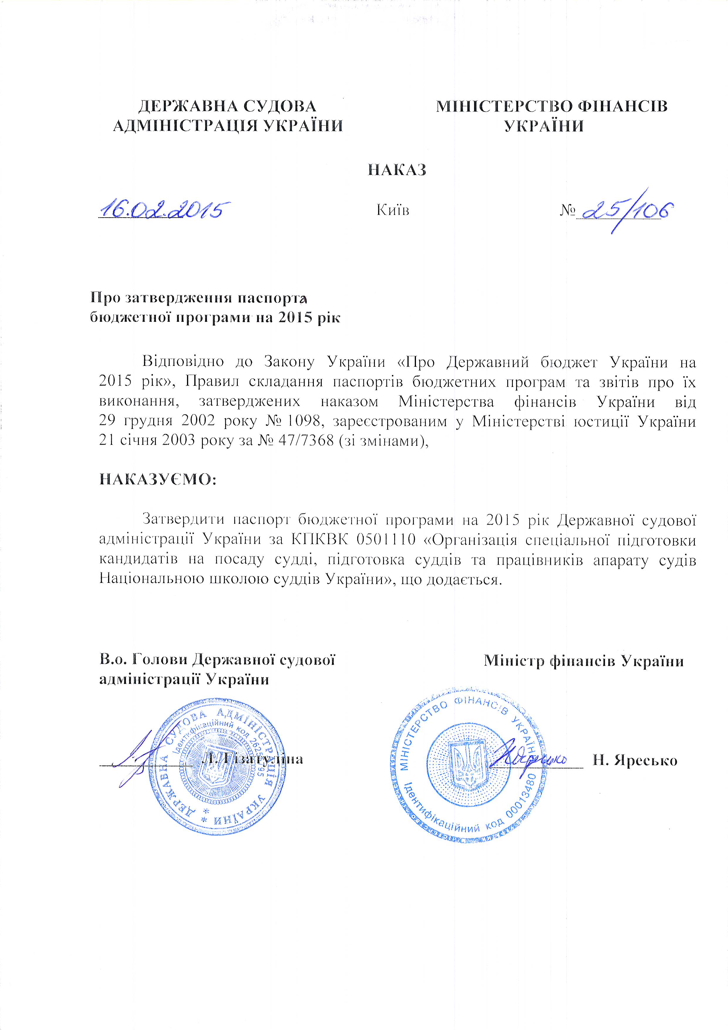 Наказ про затвердження паспорта бюджетної програми на 2015 рік