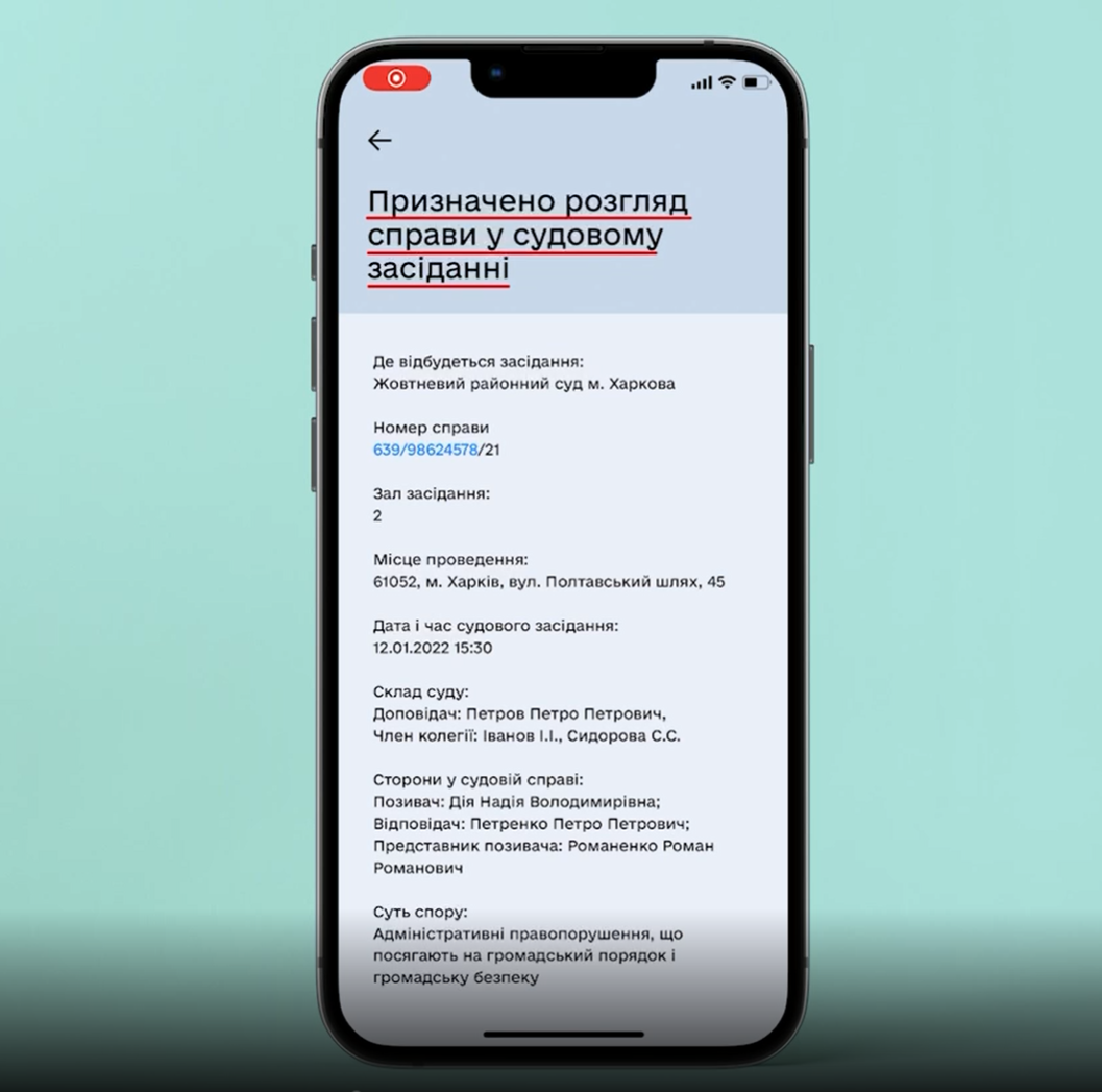 На сьогодні користувач мобільного застосунку "Дія", як учасник судового процесу, вже отримує повідомлення з інформацією про назву та адресу суду, номер зали судового засідання, єдиний унікальний номер справи, суть спору та сторони у справі.
