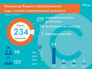 За результатами розгляду документів, поданих від 234 кандидатів на конкурс до Вищого спеціалізованого суду з питань інтелектуальної власності (ІР-суд), ВККСУ допустила 219 кандидатів. Із них 94 жінки та 125 чоловіків.