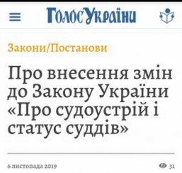 06.11.2019 у газеті "Голос України" оприлюднено Закон України "Про внесення змін до Закону України "Про судоустрій і статус суддів" та деяких законів України щодо діяльності органів суддівського врядування" від 16.10.2019 № 193-IX